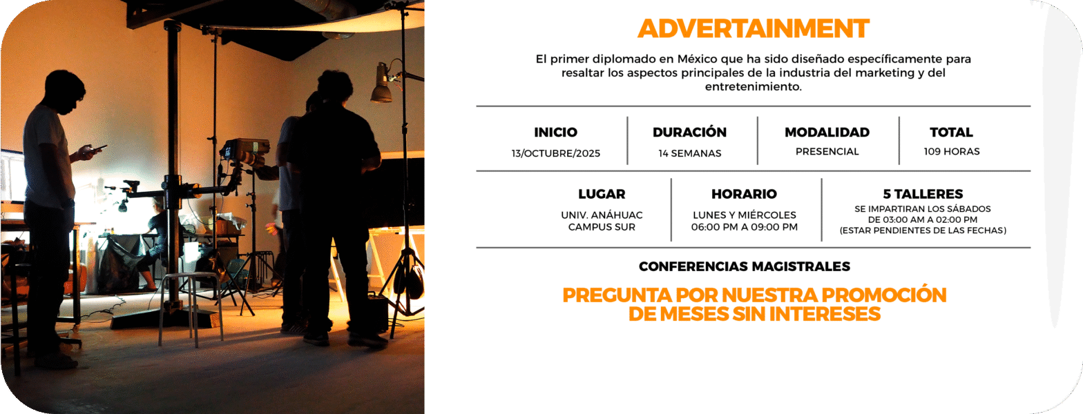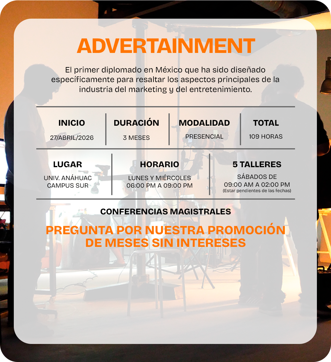 Un diplomado diferente y único para mentes creativas dispuestas a revolucionar el mundo del marketing en conjunto con la industria del entretenimiento.